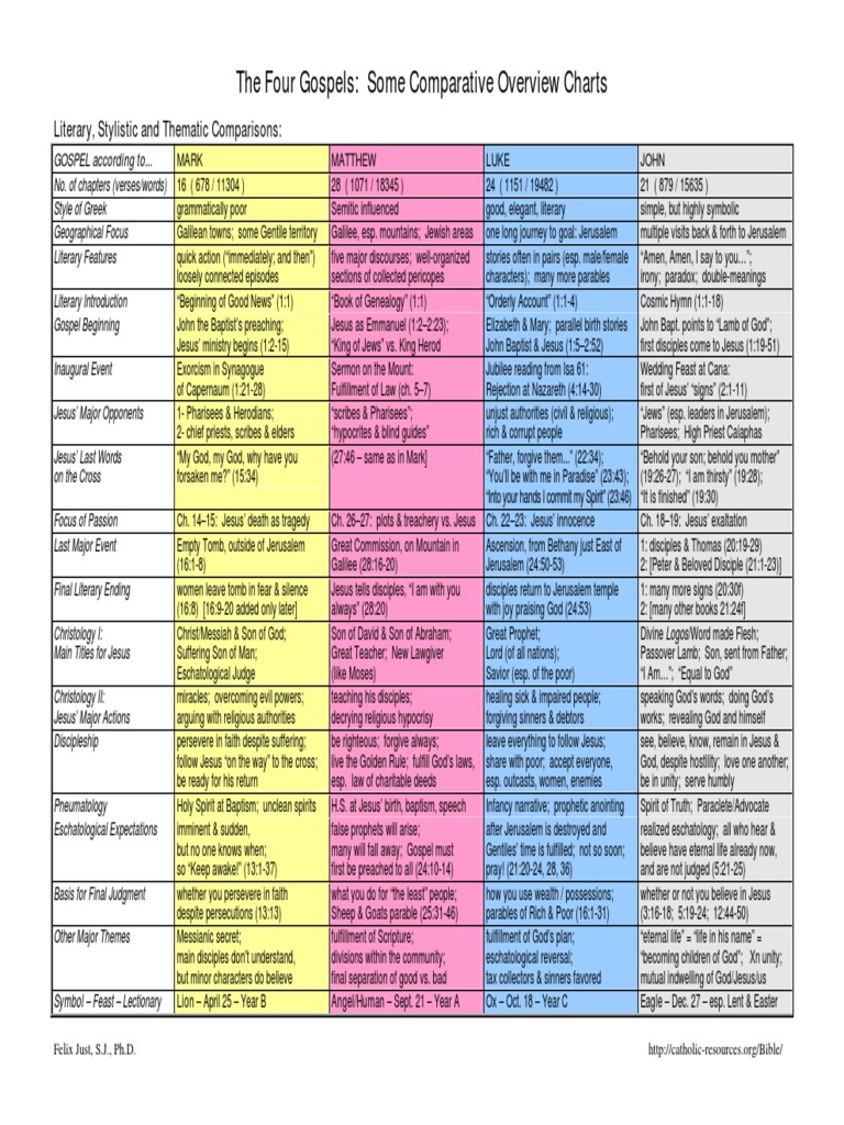 Chart comparing resurrection accounts in gospels. Harmony of the Four Gospels Chart Comparison of the Four Gospels in the Bible. At first glance there appear to be clear differences between each of the four gospel accounts of the Resurrection of Jesus Christ. Some minor and some major.