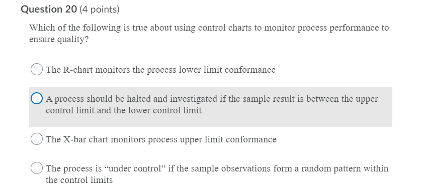 Question 6 25 pts With which of the following should we use an Rchart based on sample means to monitor process quality. The x-bar and s-chart are quality control charts used to monitor the mean and variation of a process based on samples taken in a given time. The x-bar and R-chart are quality control charts used to monitor the mean and variation of a process based on samples taken in a given time.