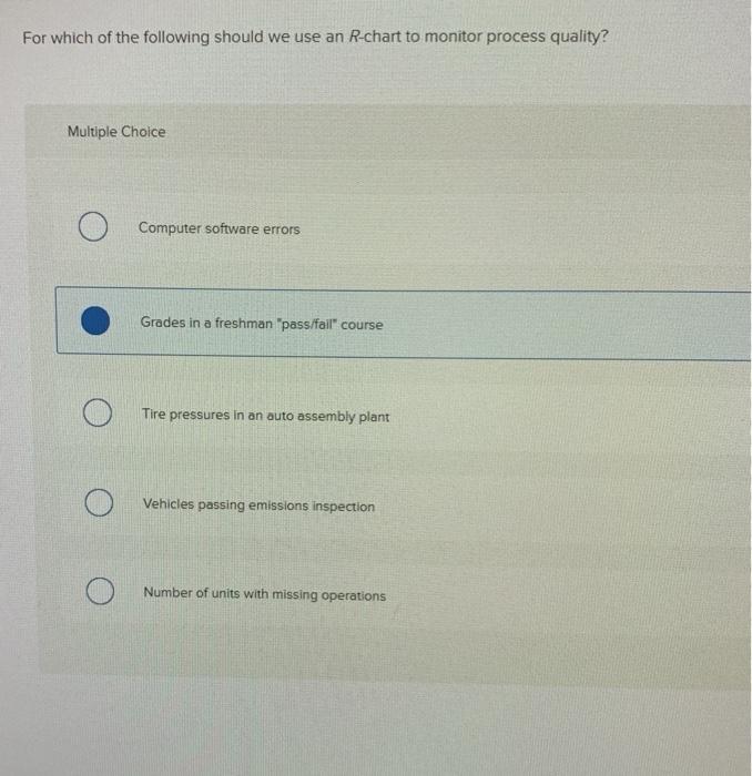 Which of the following should we use an R chart to monitor process quality. Bank statements with errors Vehicles passing emissions inspection Deciding whether an airliner has sufficient fuel for its trip Grades in a freshman passfail course The weight of fluid in a container. X bar R chart is used to monitor the process performance of a continuous data and the data to be collected in subgroups at a set time periods.
